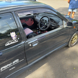 The seating arrangement for this trip were different than usual. My buddy Matt, owner of the black 1994 Subaru Vivio RX-R (KK4, 5MT) (the only car out there!) and I decided that we'd swap vehicles for the drive. OK, to be honest, it was all so I could get some seat time in the RX-R. Ever since I found that I fit in them earlier this year I really, really wanted to drive one. Matt has a Recaro SR-7 in his Vivio. Being a tall guy himself, he's got it mounted way down on the floor. I'm just a couple of inches taller than Matt, but I fit! Ok, so "fit" may be following my own made-up rules, but I was able to get in there and drive. (I've got maybe an inch (25 mm) between my skull and the headliner in there.) If I fits, I sits. ...and drives.
